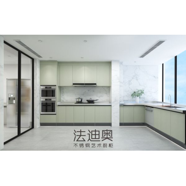 Introducing Fadior's stainless steel kitchen cabinet, a modern design that exudes a fresh and vibrant atmosphere. The kitchen features mung bean gray door panels and natural stainless steel countertops, beautifully complemented by light-colored marble flooring. A standout feature is the white marble wall cladding, which perfectly enhances the green-themed kitchen. The layout is ingeniously divided by a central partition wall, while a side glass door can be closed to prevent cooking fumes from escaping, ensuring a clean and spacious environment. The black baseboard ties the design together, adding a sophisticated touch. Additionally, the refrigerator and mini bar are thoughtfully placed outside the glass door, maximizing kitchen space and incorporating an open wine cabinet for increased storage capacity.